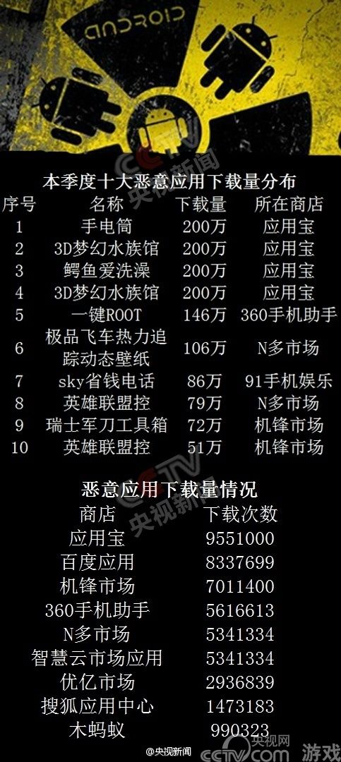 如今智能手机已经相当普及,而手机应用在给用户带来便利的同时也带来了安全隐患。央视也对此给予了极大的关注,昨日,国家网络信息安全研究所发布了2013年第二季度的中国互联网、中国移动互联网应用安全检测与分析报告,公布了十大恶意手机应用排行榜。在十大恶意软件排名中,位居首位的是一款名叫“手电筒”的应用。